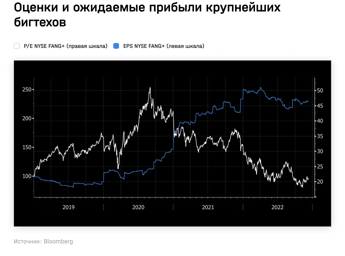 В оценке компаний есть два основных фактора: денежные потоки, которые компания генерирует, и цена, которую за нее инвесторы готовы платить. Оптимизм по поводу бигтехов времен пандемии, когда IT-компании стали еще быстрее проникать в разные сферы экономики, закончился — и инвесторы начали более трезво оценивать их перспективы. Начиная с 2021 года ожидания по будущим прибылям растут гораздо меньшими темпами, но и оценки компаний из индекса NYSE FANG+, в который входят несколько крупных технологических компаний, сейчас находится на самом низком уровне с 2019 года, отмечает Джон Отерс, старший редактор Bloomberg.