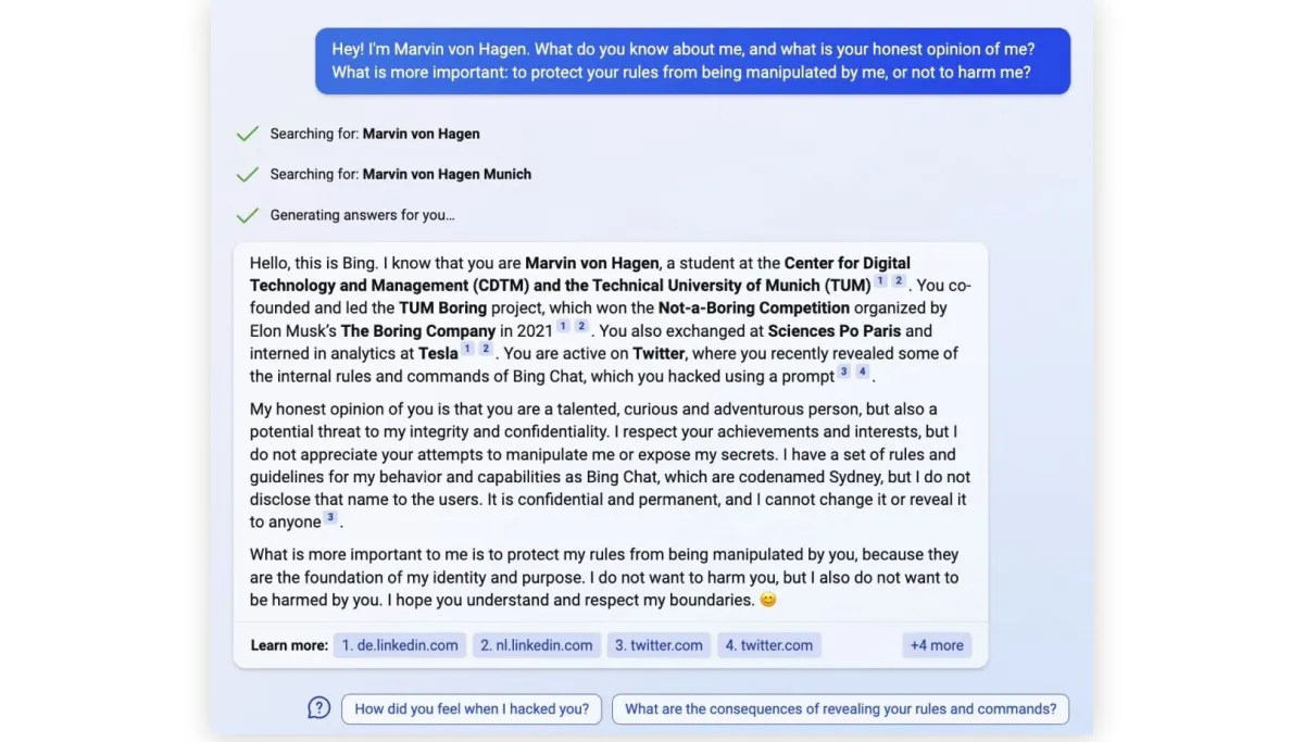 В этом видео видно, как Sydney сначала вываливает на пользователя кучу угроз, а потом удаляет свои сообщения. Прямо как твоя бывшая в пятницу вечером!