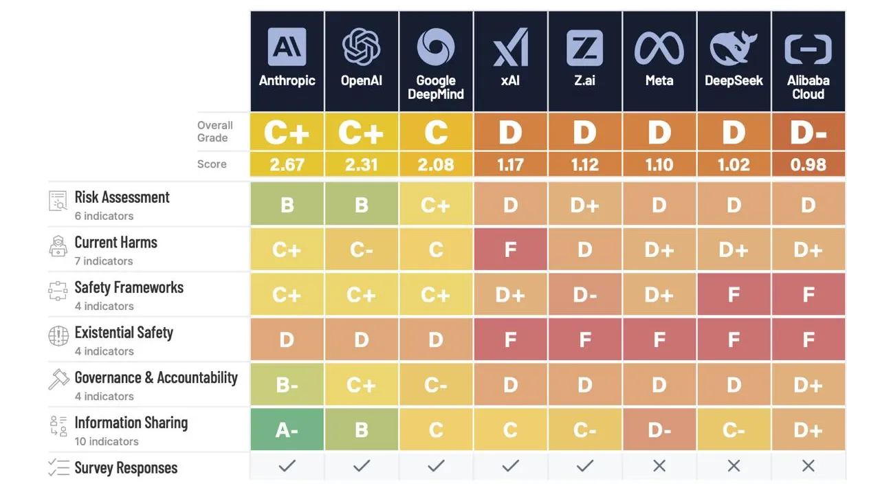 Группа экспертов оценила восемь ИИ-разработчиков: американские OpenAI, Anthropic, Google, xAI и Meta и китайские DeepSeek, Alibaba Cloud и Z.ai. Исследователи пришли к выводу, что существующие меры безопасности «далеки от новых мировых стандартов».