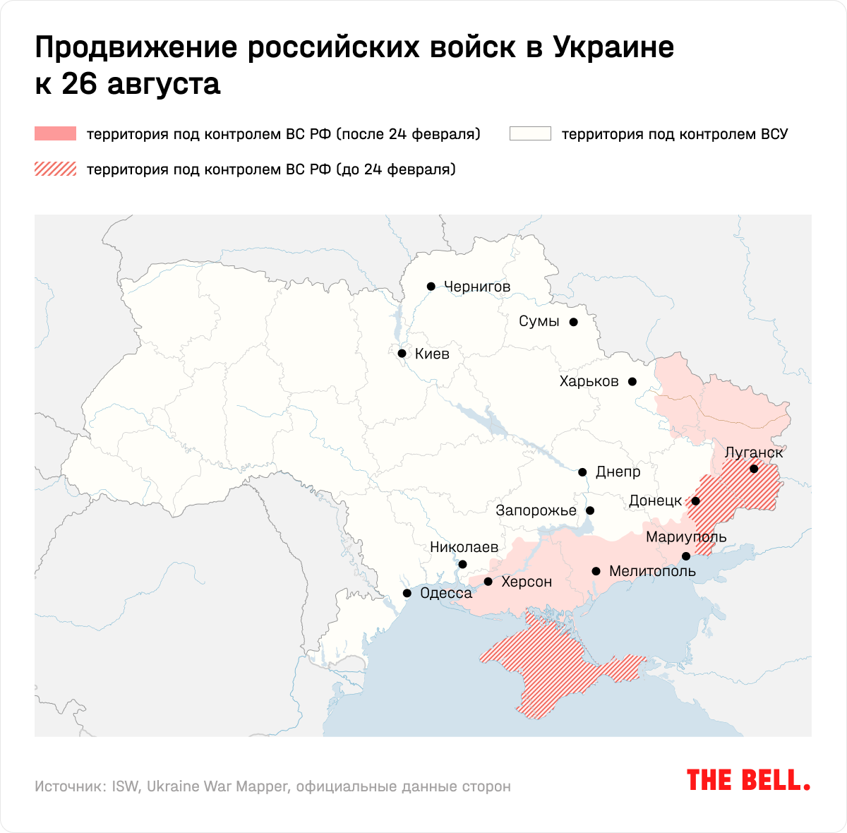 Наибольших успехов российские военные смогли добиться на юге — в первую неделю войны была захвачена большая часть Запорожской (без областного центра) и Херсонской областей. С начала апреля все основные боевые действия происходили в Донбассе, где ВС РФ, сменив тактику, начали медленно вскрывать украинские оборонительные позиции с помощью артиллерии. За это время им удалось преодолеть только первый рубеж, взяв Северодонецк и Лисичанск и объявив об «освобождении» 100% территории ЛНР. Но после полугода боевых действий силы обеих сторон истощены, а на переговоры ни одна из них не готова — и эксперты сходятся в том, что предпосылок для окончания войны до конца 2022 года нет.