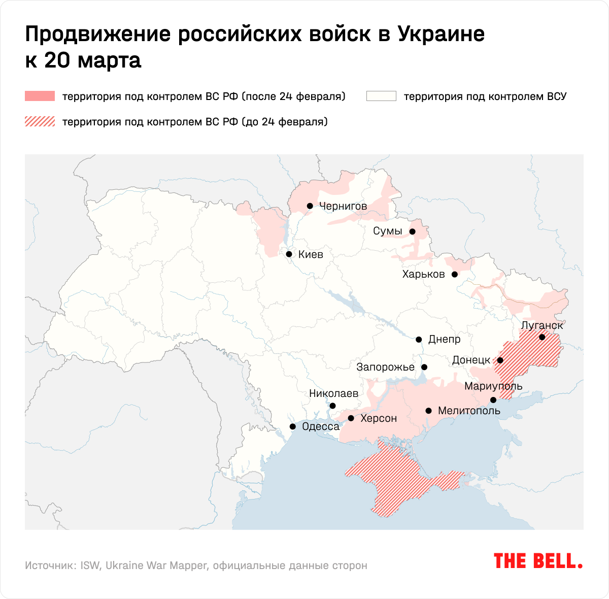 И ход боевых действий на первом этапе войны, и заявления Владимира Путина в первые дни, и западные данные не оставляют сомнений: начатая 24 февраля «спецоперация» планировалась с расчетом на быстрый развал украинской обороны и падение правительства. Но ВСУ смогли остановить российские войска на подступах к Киеву и выдержать ожесточенные бои в пригородах (подробно об этом на этой неделе рассказала The Washington Post). В начале апреля российская сторона, объявив это «жестом доброй воли», вывела войска с севера Украины.