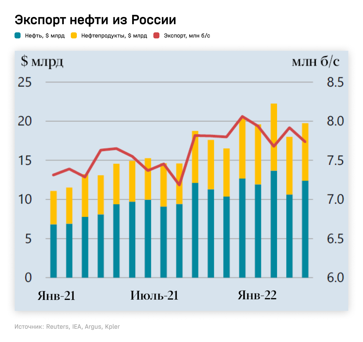 До 24 февраля полное эмбарго на импорт российской нефти в Европу трудно было даже представить, но после событий в Буче оно стало реальностью. До войны на Европу приходилось 50% российского экспорта нефти. Но пока эффект санкций остается скромным: России за счет 30-процентных скидок удалось перенаправить все выпавшие европейские объемы в Азию и продолжить зарабатывать рекордные нефтегазовые доходы (рост на 69% за первое полугодие 2022 года).