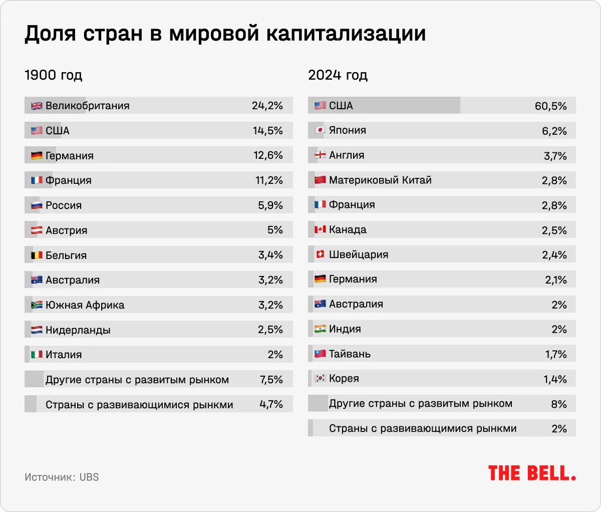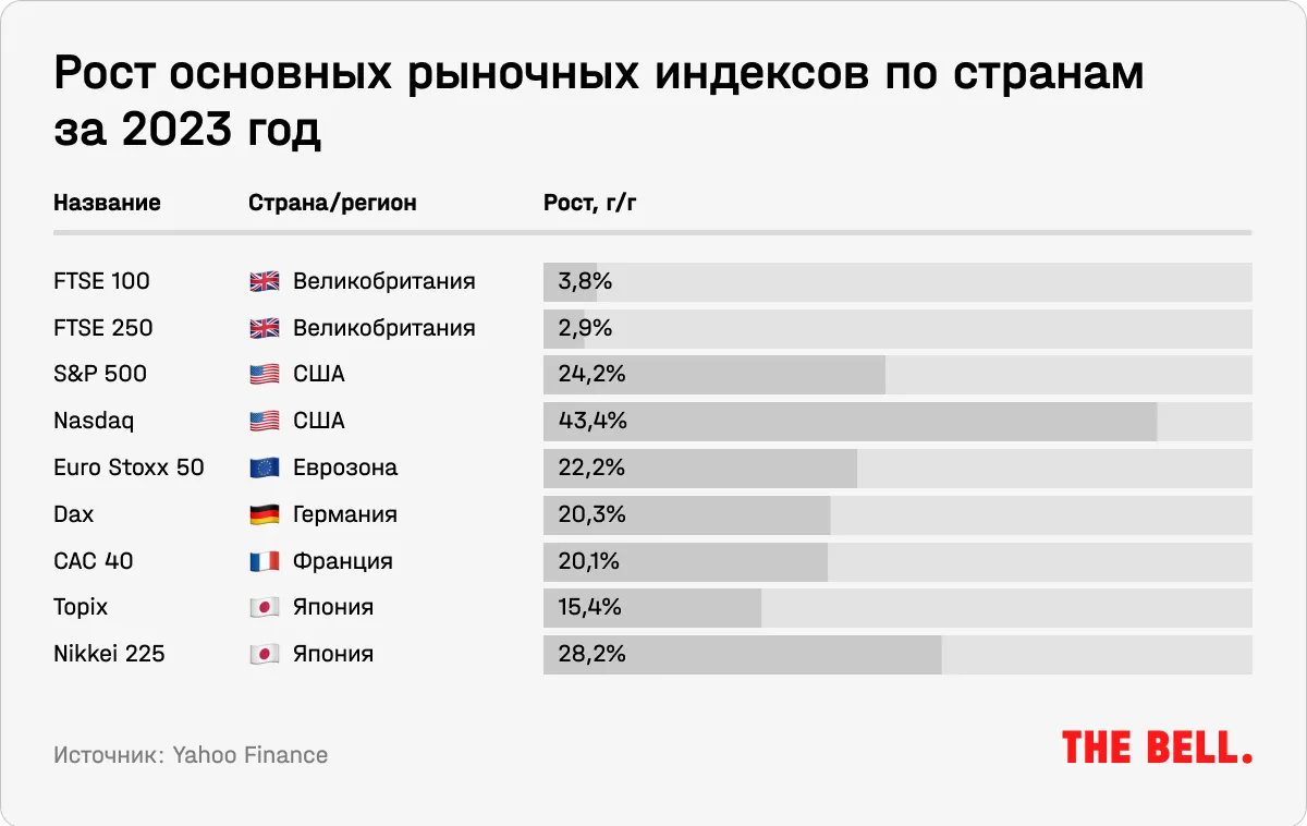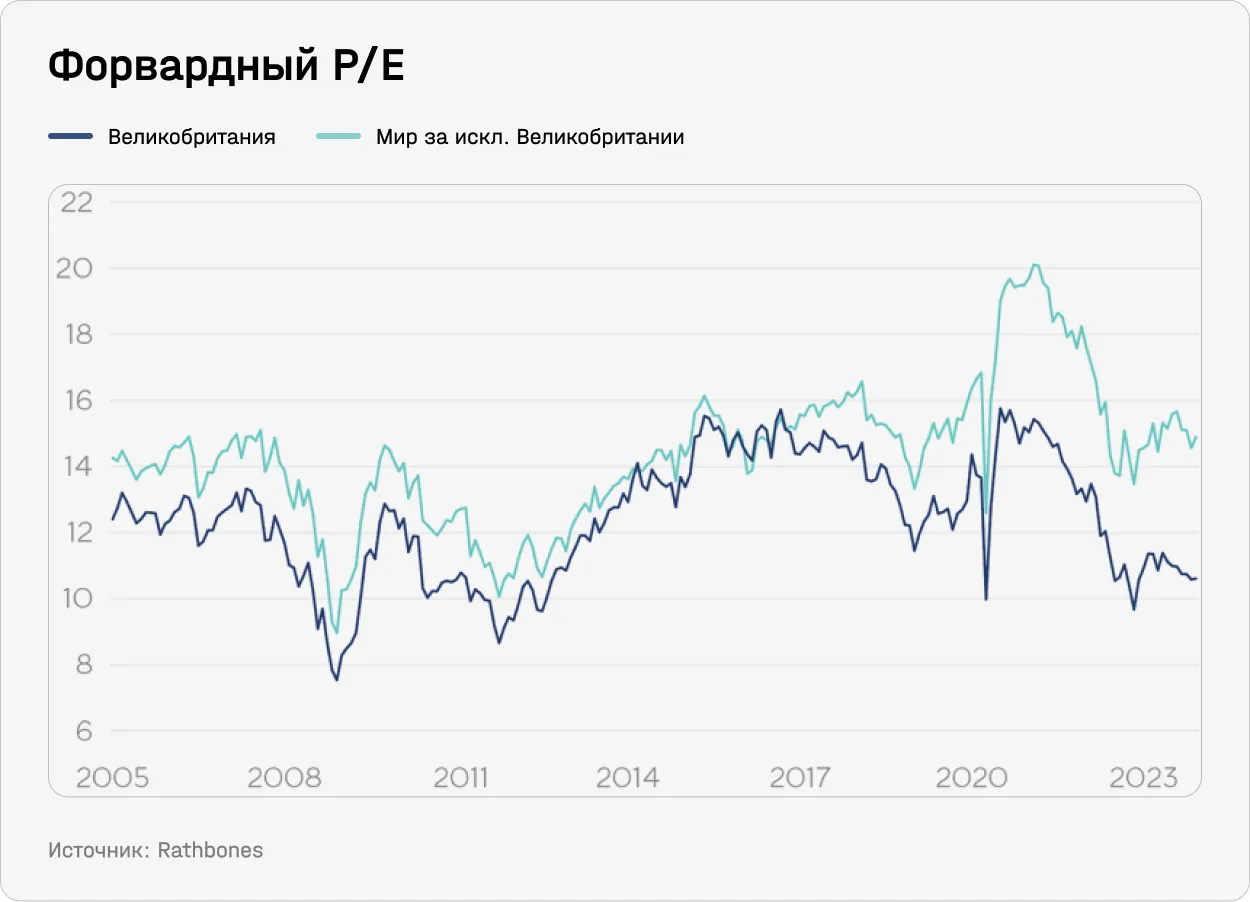 Многие аналитики, в том числе те, отчеты которых есть у The Bell, считают, что рынок Великобритании сейчас выглядит привлекательно. Бен Лейдлер, стратег по глобальным рынкам на платформе eTor отмечает, что рынок Великобритании, чувствительный к ожиданиям по ставкам из-за большой доли строительного сектора, может в 2024-м выиграть из-за начала смягчения ДКП.