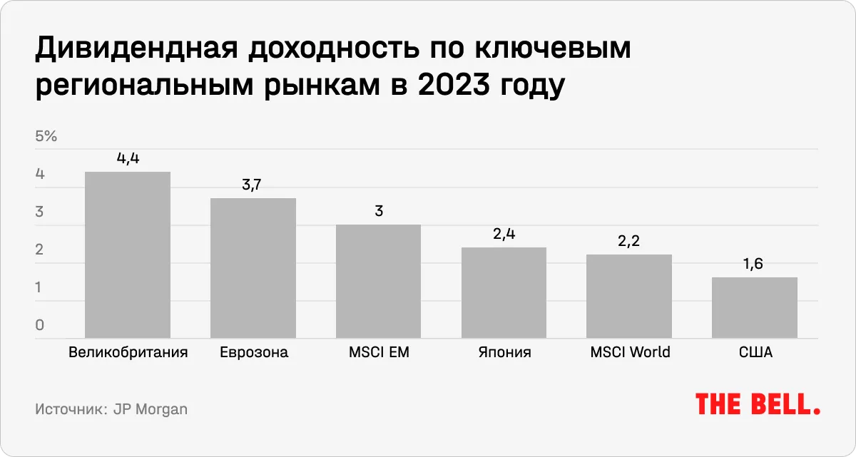 2. Высокая дивидендная доходность. Британские компании отличаются более консервативным подходом к аллокации капитала. Благодаря этому они могут предложить гораздо более высокую дивидендную доходность по сравнению с другими странами. По данным Bloomberg, в 2023 году этот показатель в Великобритании составил 4,4%. Для сравнения, у США он почти в три раза ниже — около 1,6%, отмечают в JP Morgan.