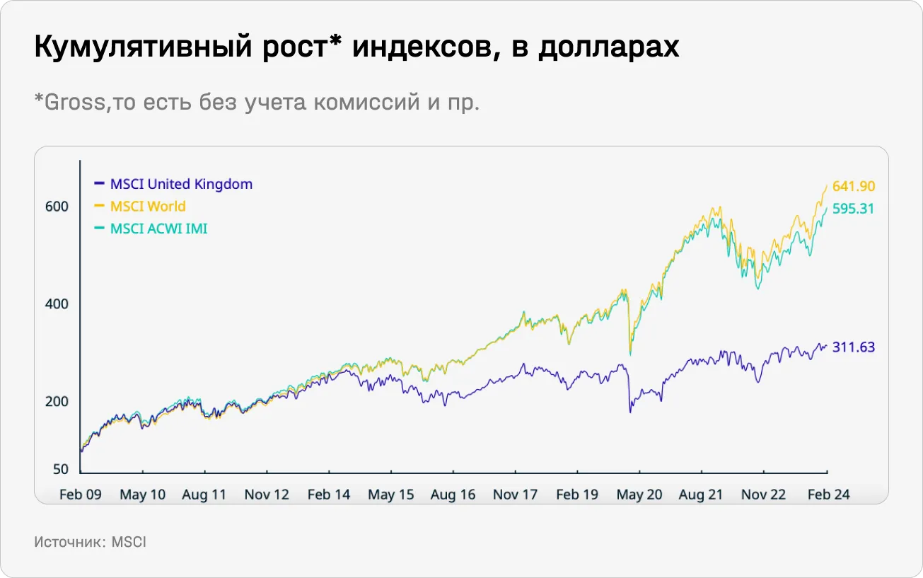 Индекс MSCI UK, который состоит из 83 британских компаний средней и крупной капитализации, покрывающий примерно 85% рыночной капитализации страны с поправкой на free float, тоже существенно отставал от глобальных индексов MSCI World и MSCI ACWI.