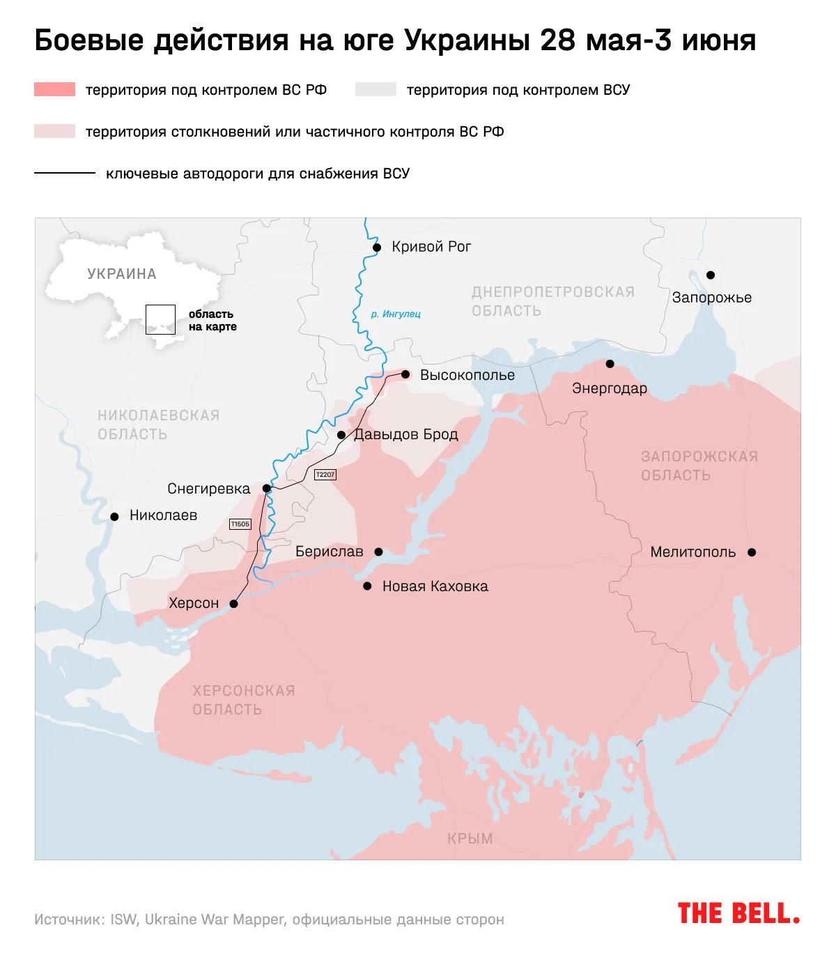 На южном направлении украинские войска вели наступление сразу с двух сторон — из Николаевской и Днепропетровской областей, в направлении Давыдова Брода и Снегиревки на разделяющей позиции сторон реке Ингулец. Успех наступления и выход ВСУ к дороге Херсон-Высокополье означал бы утрату ВС России позиций для дальнейшего наступления и необходимость укреплять оборону вокруг Херсона, а также оттягивать подкрепления от Донбасса.