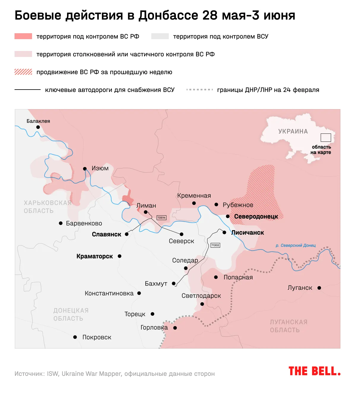 В пятницу с начала войны исполнилось 100 дней. Всю прошедшую неделю российские войска в Донбассе продолжали медленно сжимать кольцо окружения на западе Луганской области, а украинские — предприняли отвлекающее контрнаступление на юге, в Херсонской области.
