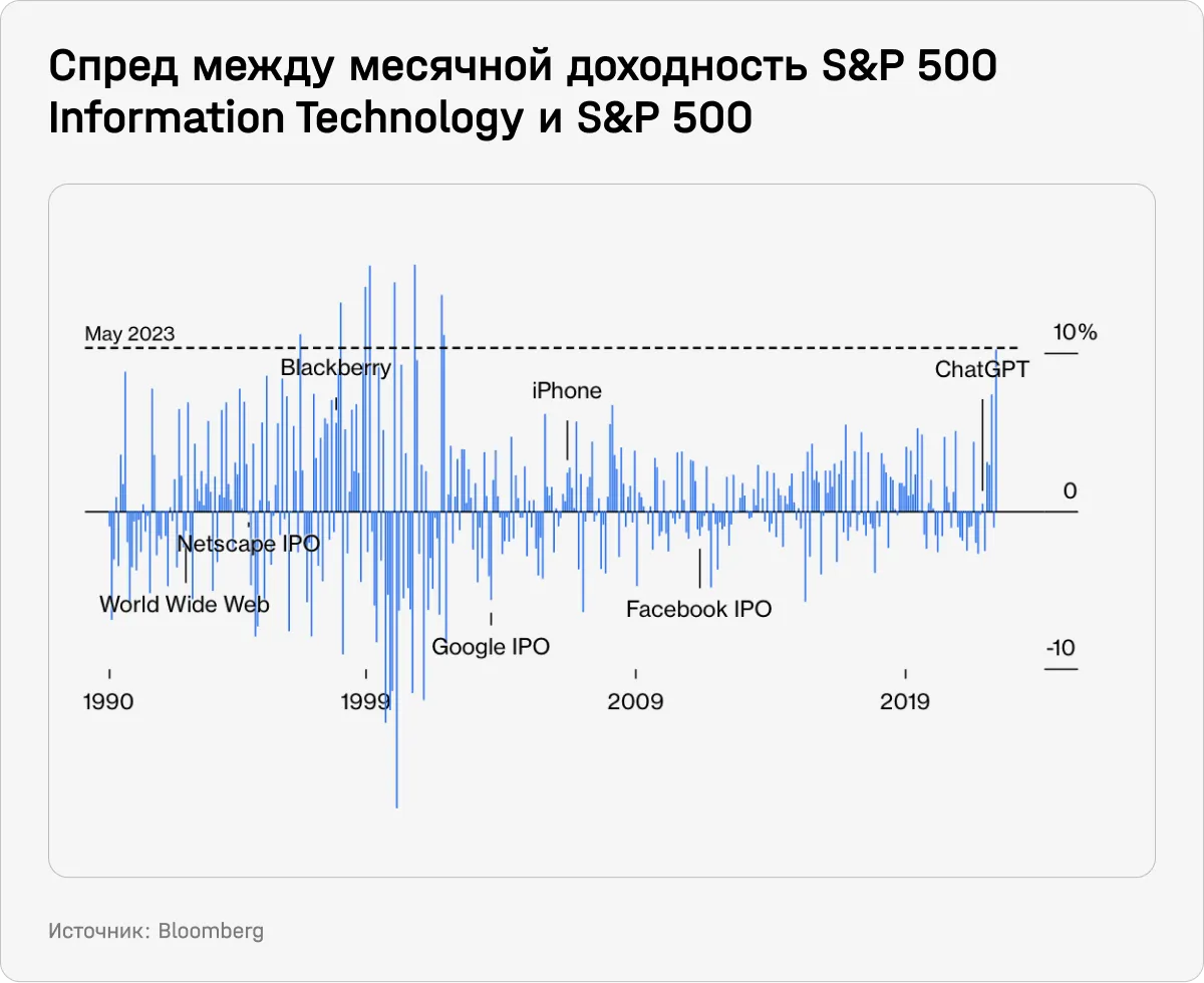 Май стал историческим месяцем для инвесторов в технологические компании: впервые за 20 лет доходность отраслевого индекса S&P 500 обогнала широкий рынок на 10 процентных пунктов. ИИ часто называют «новым iPhone» по масштабу влияния на бизнес компаний, но даже когда Apple выпустила свой первый смартфон, подобной дивергенции не наблюдалось. И это при том, что доля IT-сектора в весе индекса за прошедшие годы сильно выросла, что делает для него опережение рынка более сложной задачей.