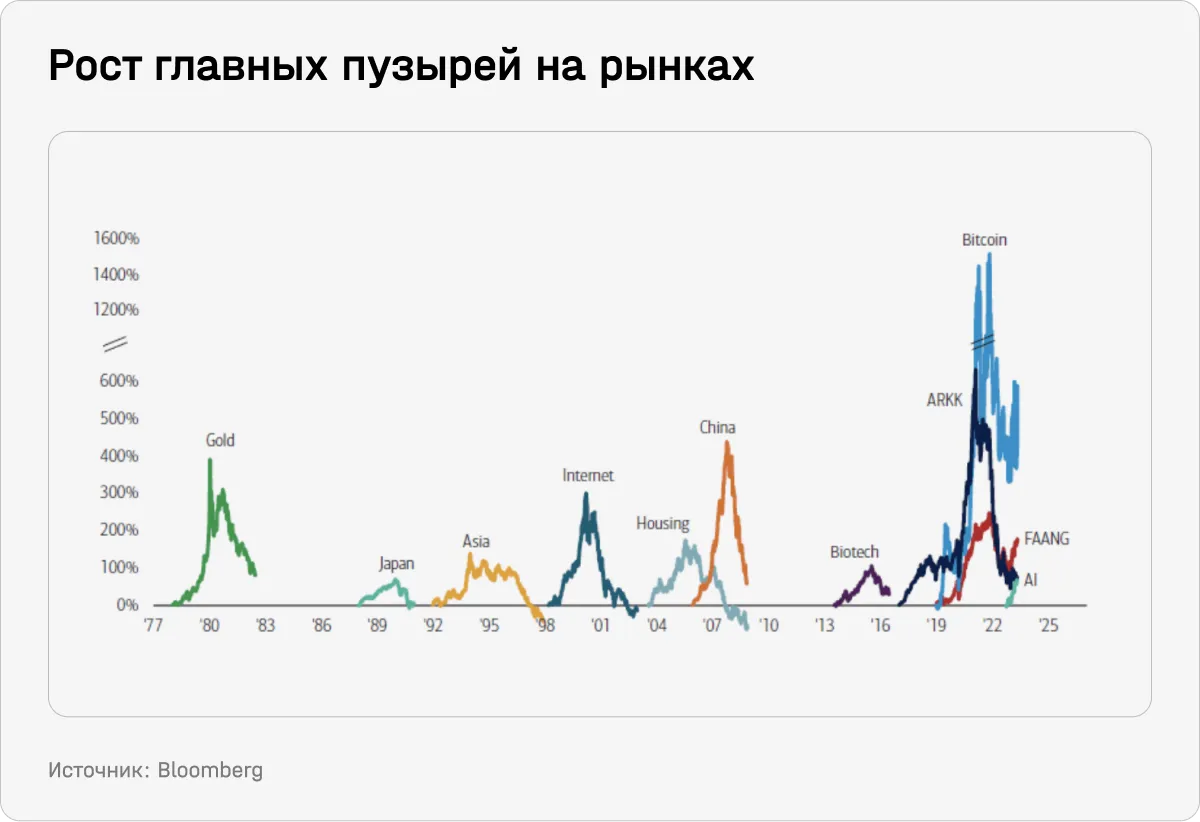 Но несмотря на отдельные истории вроде взлета капитализации Nvidia, по масштабам хайп вокруг ИИ пока даже не приблизился к «пузырю доткомов». В Bank of America текущую ситуацию на рынке даже называют baby bubble (пузырь-малыш). Он также значительно меньше и недавнего взлета биткоина, фондов Ark Invest Кэти Вуд и бигтехов, объединенных аббревиатурой FAANG.