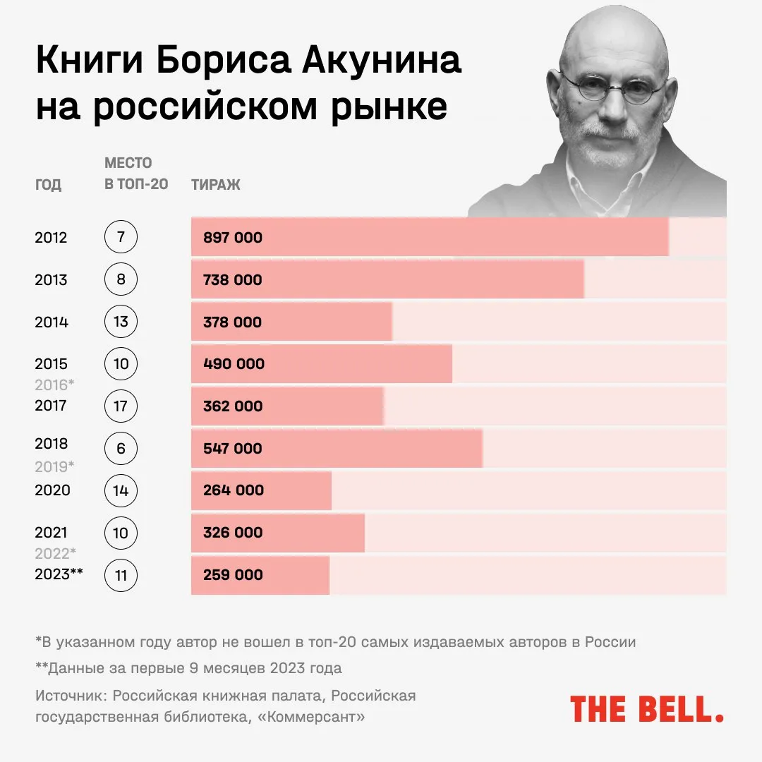 За последние 11 лет Борис Акунин неоднократно входил в топ-20 самых издаваемых авторов в России, а его книги издавались тиражами в сотни тысяч экземпляров. Суммарный тираж его книг за все время — 30 млн экземпляров (данные АСТ). Для сравнения: всего за 2022 год АСТ выпустило 9650 наименований книг, чей общий тираж составил 43 млн экземпляров, следует из статистики Российской государственной библиотеки.