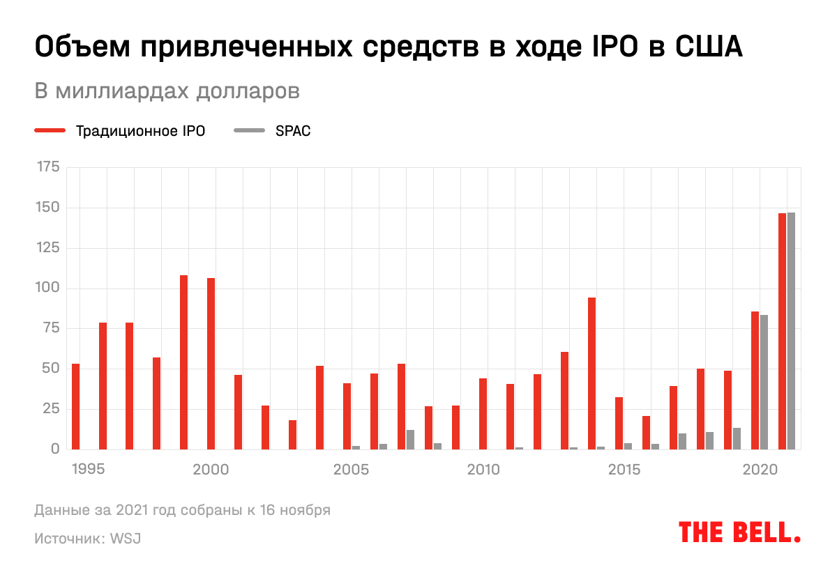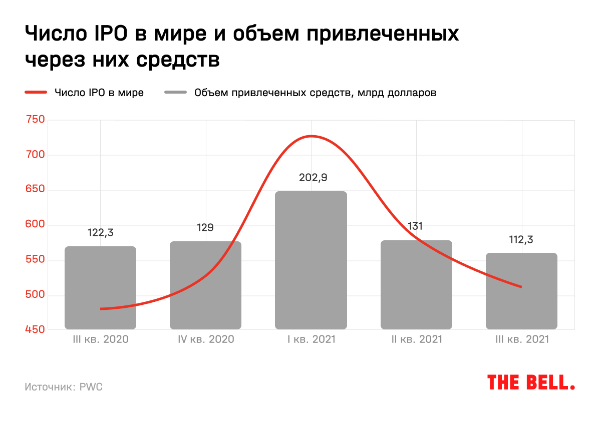Бум IPO, начавшийся в прошлом году, пока и не думает останавливаться. По оценке Bloomberg, за 10,5 месяцев 2021 года на биржи по всему миру, в том числе через SPAC, вышли 2850 компаний, которые привлекли более чем $600 млрд. Это рекорд как по числу размещений, так и по объему привлеченных средств. В США ситуация похожа.