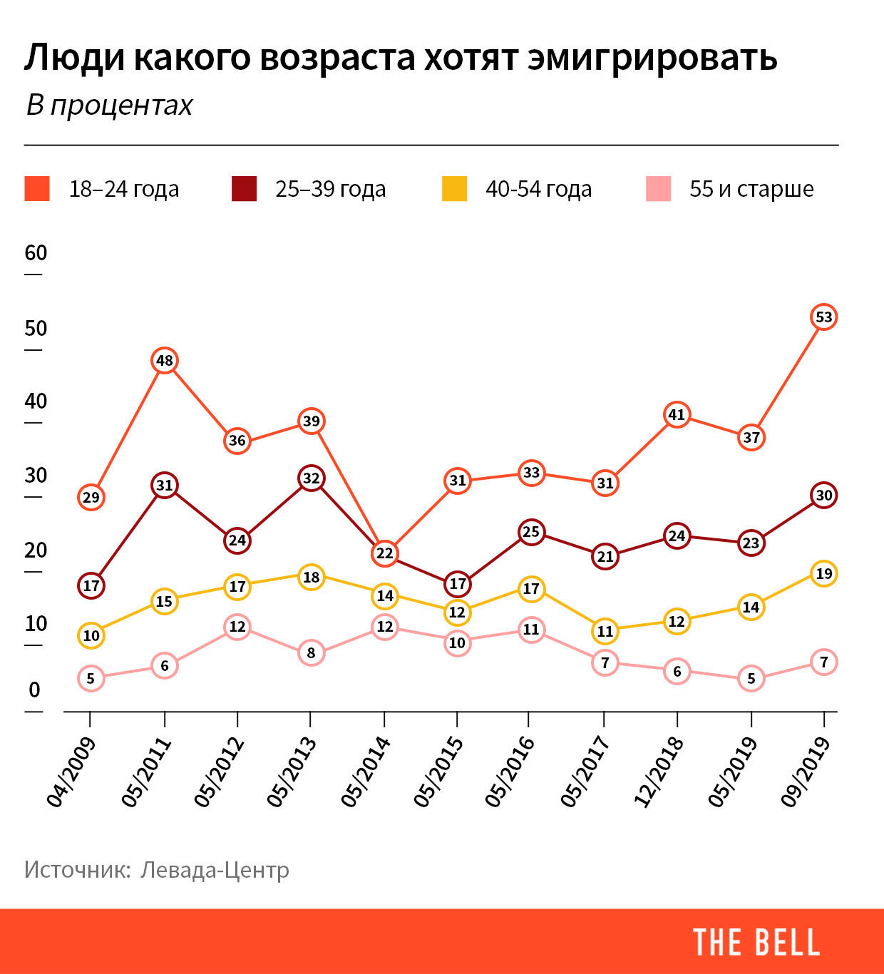 Главные результаты. По данным «Левада-центра», эмигрировать из России хотели бы 53% россиян в возрасте от 18 до 24 лет (сумма ответов «однозначно да» и «скорее, да» на вопрос «хотели бы вы переехать за границу на постоянное место жительства?». Это рекорд с 2009 года. Минимум желающих уехать молодых людей был зафиксирован в мае 2014 года — около 20%. С тех пор эта цифра увеличивалась. Резкий — сразу на 16 п.п. — рост пришелся на период с мая по сентябрь 2019 года.