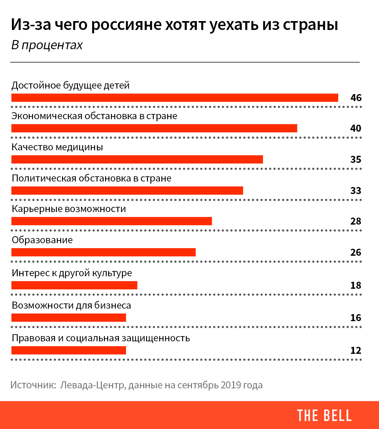 Что не так в России. Основная причина, которая заставляет задуматься об эмиграции респондентов всех возрастов, — беспокойство за будущее детей (ее называли 45% желающих уехать). На втором месте по популярности – экономическая обстановка, на третьем – высокое качество медобслуживания за рубежом и политическая обстановка в России.