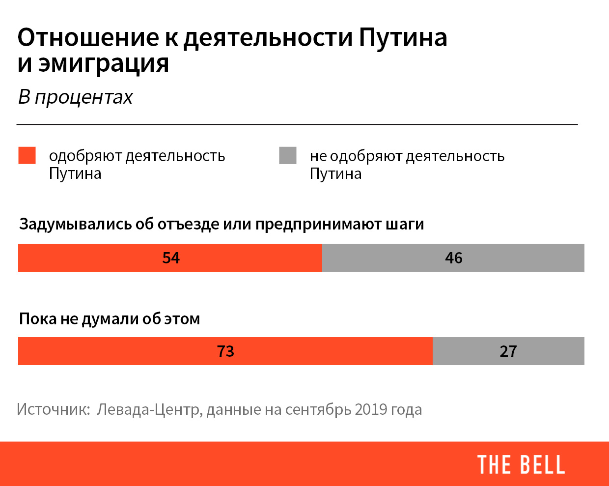 Настроения. Среди тех, кто задумывался о переезде, деятельность Владимира Путина не одобряет гораздо больше людей, чем в среднем по стране (73% против 54%).