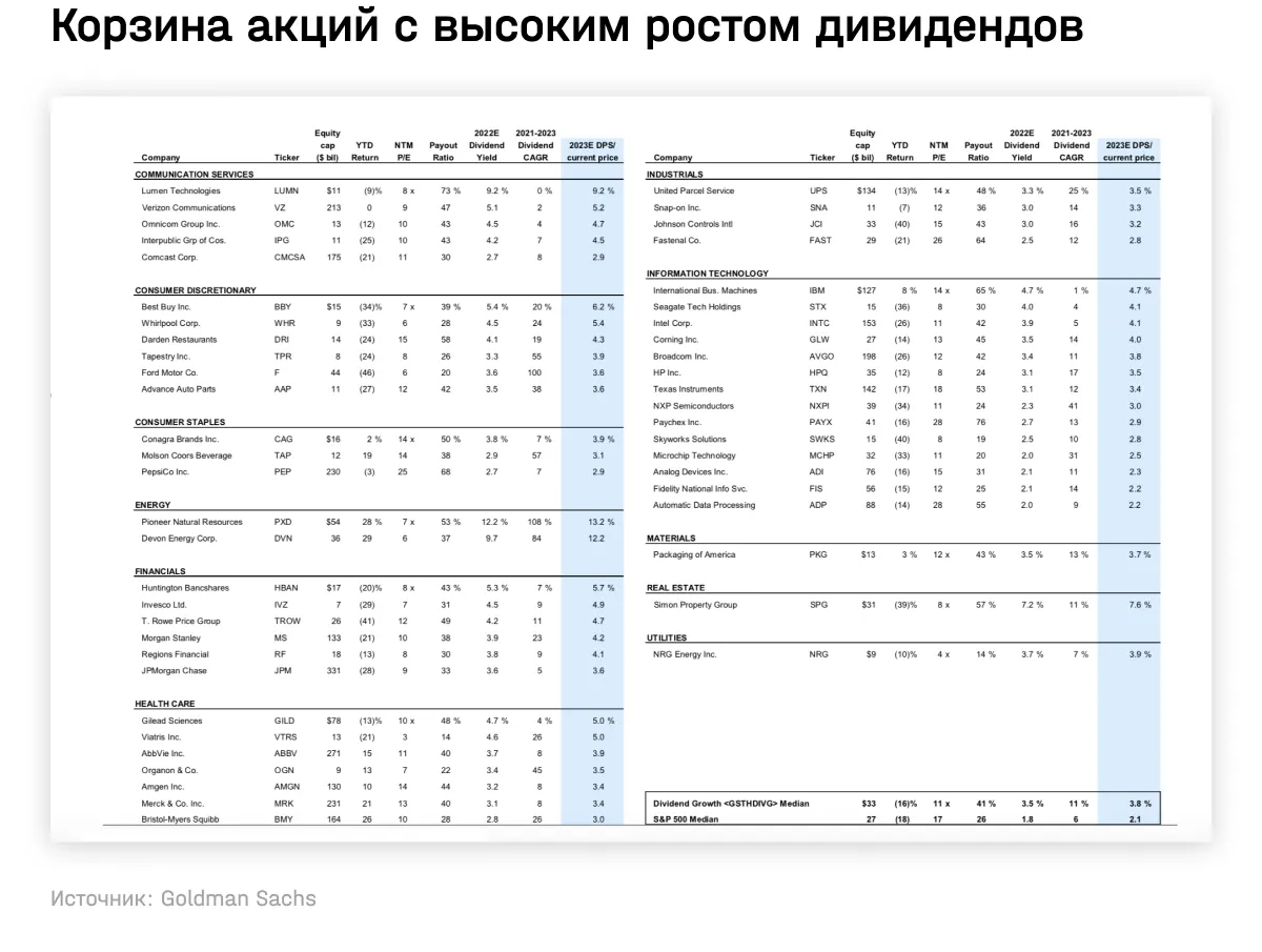 3. Дивиденды будут привлекательными, даже если произойдет рецессия. В медианной по глубине рецессии с 1945 года дивиденды падали только на 1%, при этом рынки ожидают более существенного снижения дивидендов. Также аналитики отдают предпочтение акциям с высокой дивидендной доходностью и устойчивым ростом дивидендов. Медианная компания из подборки ниже торгуется с дивидендной доходностью в два раза выше средней (3,8% против 2,1%), в два раза более быстрым ростом дивидендов (11% против 6%) и по более низким P/E, чем медианная акция из S&P 500.