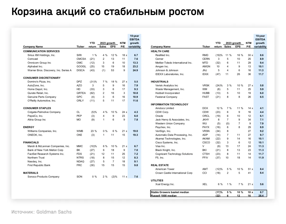 1. Компании со стабильным ростом прибыли. При замедлении экономического роста и ужесточении финансовых условий акции «качественных компаний» исторически превосходят рынок. Вот на какие акции обращают внимание в инвестбанке (с начала года доходность корзины этих акций опередила доходность индекса S&P 500 на 4 п. п.).