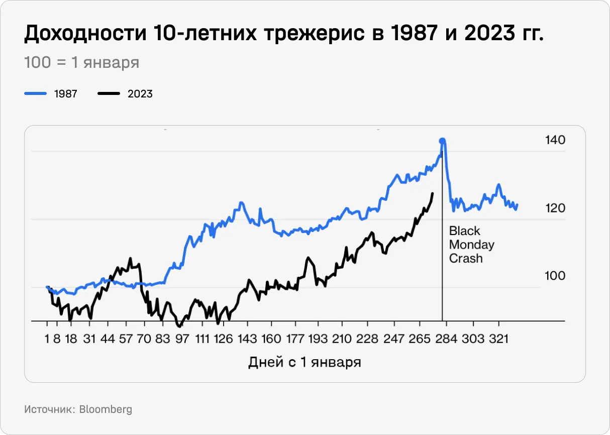 Некоторые стратеги уже видят «тень 1987-го»: динамика роста доходностей 10-летних трежерис в 2023-м действительно напоминает то, что происходило перед «черным понедельником». Это не означает автоматически скорого крушения рынков акций, но иллюстрирует масштабы происходящих событий.