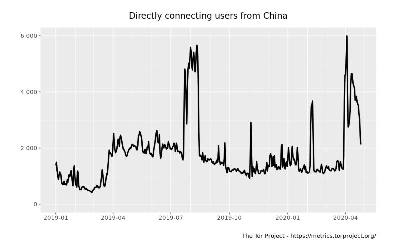 В Китае тоже рост, но абсолютные цифры малы — в этой стране Tor эффективно блокируется. Средний показатель для 2019 года составляет 2 тысячи пользователей в сутки. Во время летних протестов в Гонконге суточная аудитория выросла до 6 тысяч пользователей. В апреле 2020 года в Tor заходят 5 тысяч китайских пользователей в сутки.
