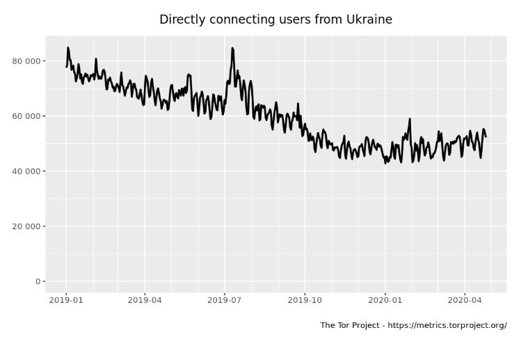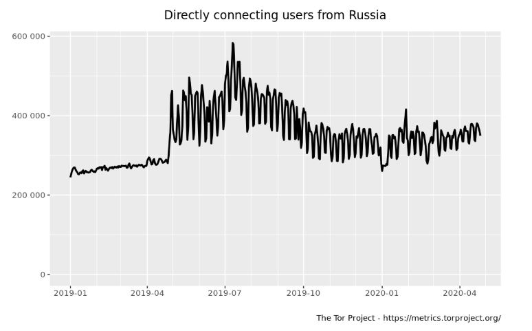 В России пик популярности Tor — 600 тысяч человек за месяц — пришелся на июль 2019 года. Русская служба BBC предлагала три объяснения: боты хакеров, попытка властей дестабилизировать даркнет и массированная рекламная кампания наркоторговцев. В дальнейшем аудитория снижалась. К началу пандемии Tor посещали 380 тысяч российских пользователей в сутки. В марте падение остановилось. Сейчас — около 400 тысяч человек в сутки.