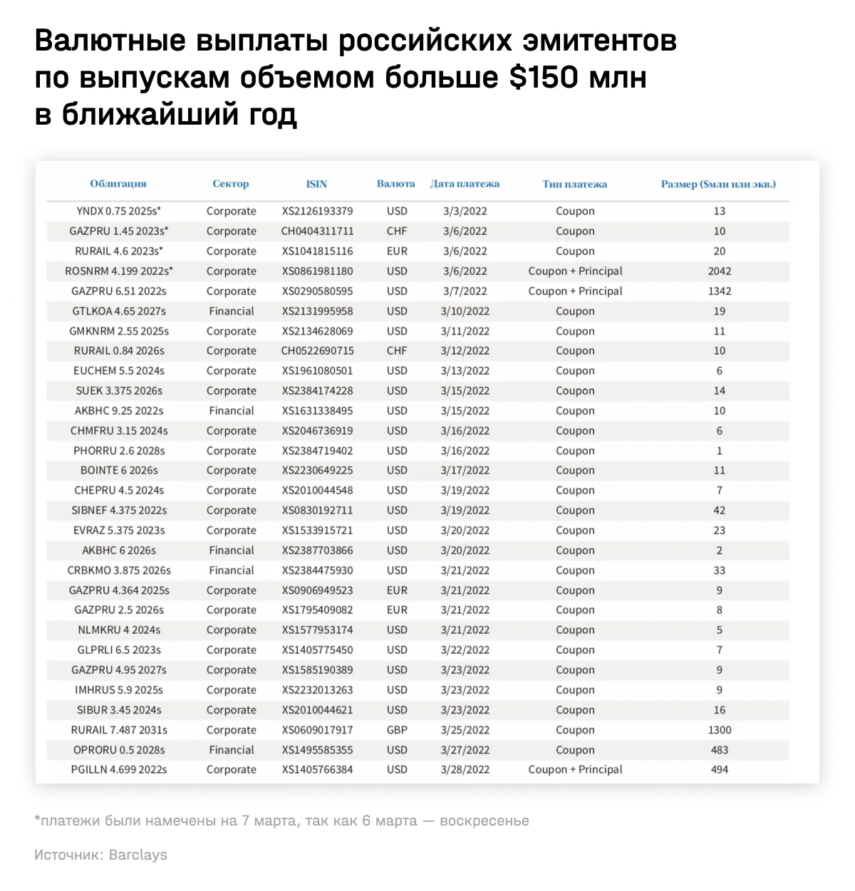 Пока российские эмитенты не допускают просрочки в выплатах валютных долгов. «Роснефть» 10 марта объявила о выплатах купонов и погашении основного долга на $2 млрд, «Газпром» в понедельник — о выплатах на $1,3 млрд. Это с большим отрывом крупнейшие платежи по евробондам российских компаний на ближайший год, следует из данных Barclays.