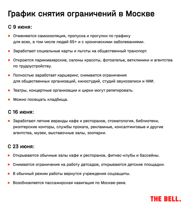 - Уже с 9 июня в Москве перестают действовать все основные ограничения — запрет на выход из дома людям старше 65 и хроническим больным, режим цифровых пропусков и и прогулки по графику для всех остальных. Работу возобновят каршеринг, парикмахерские, салоны красоты, общественные организации, кадровые агентства.
