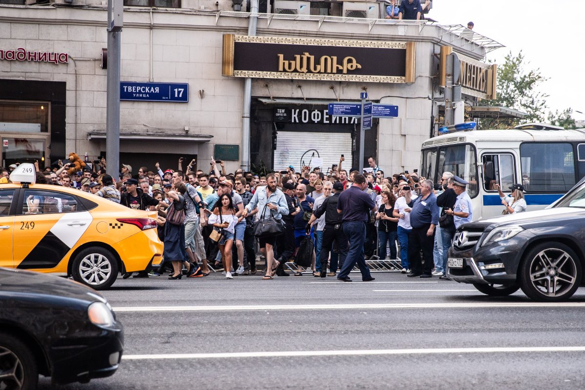 Протестующие в Столешниковом простояли лицом к лицу с двумя оцеплениями ОМОНа около часа, но примерно в 16:30 полиция смогла со второй попытки оттеснить толпу в сторону Дмитровки.
