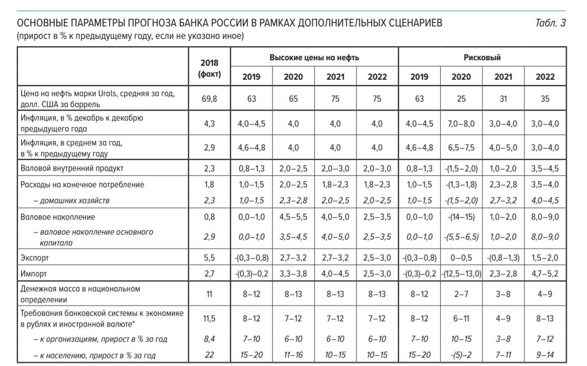 • Базовый сценарий также исходит из замедления роста мировой экономики, но не такого быстрого — и без рецессии в США. Он предполагает, что в 2019 году российская экономика вырастет на 0,8–1,3%, а затем будет постепенно ускоряться — от 1,5–2% в 2020 году до 2–3% в 2022-м. Основной вклад в рост внесет повышение государственных инвестиционных расходов на нацпроекты, а экспорт из-за неблагоприятных внешних факторов будет расти умеренно.