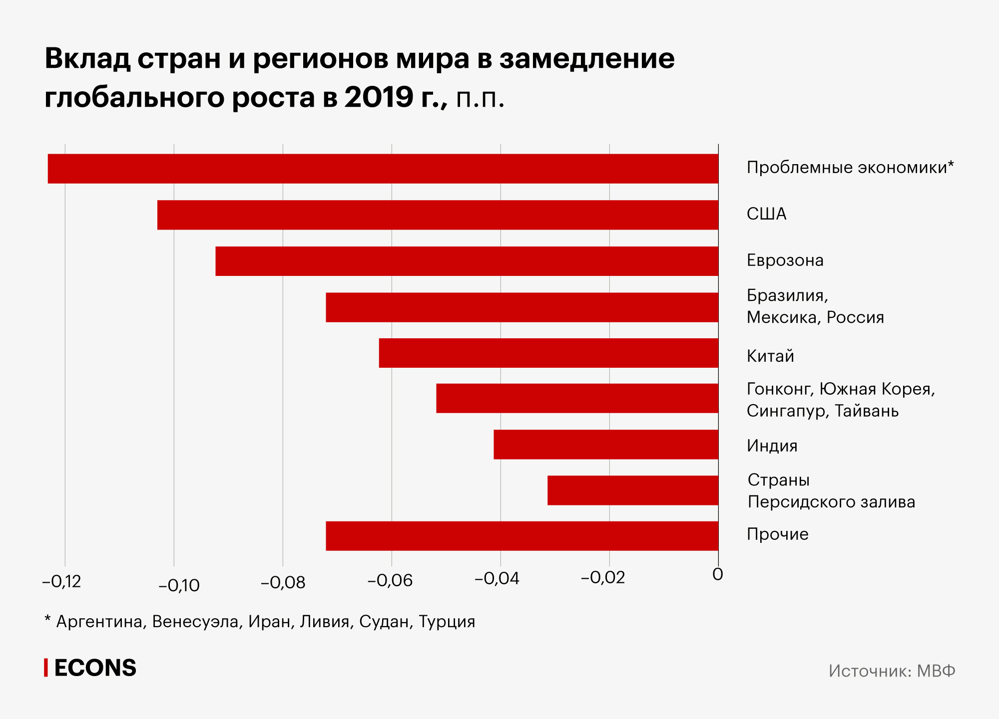 Самые низкие темпы роста со времен глобального финансового кризиса и активные действия центробанков – итоги года в пяти графиках подводят в блоге МВФ директор исследовательского департамента Гита Гопинат и ее соавторы. Новые торговые барьеры и связанная с этим неопределенность негативно сказались на деловой активности и настроениях по всему миру, а в развитых странах и в Китае дополнительно усилили циклическое замедление. Тормозом глобального роста стали и экономики, замедляющиеся в силу локальных причин: экономических, геополитических и социальных. Свой вклад в торможение мирового роста внесла и Россия (см. график). Центральные банки реагировали агрессивно: ставки снизились практически повсеместно как в развитых, так и в крупных развивающихся странах. Такая политика предотвратила более серьезное замедление: пониженные ставки поддержали спрос и способствовали созданию рабочих мест. Но станут ли эти проблески основой для более быстрого роста в следующем году? На этот вопрос экономисты МВФ обещают дать ответ в новом обзоре мировой экономики, который будет опубликован 20 января 2020 года.