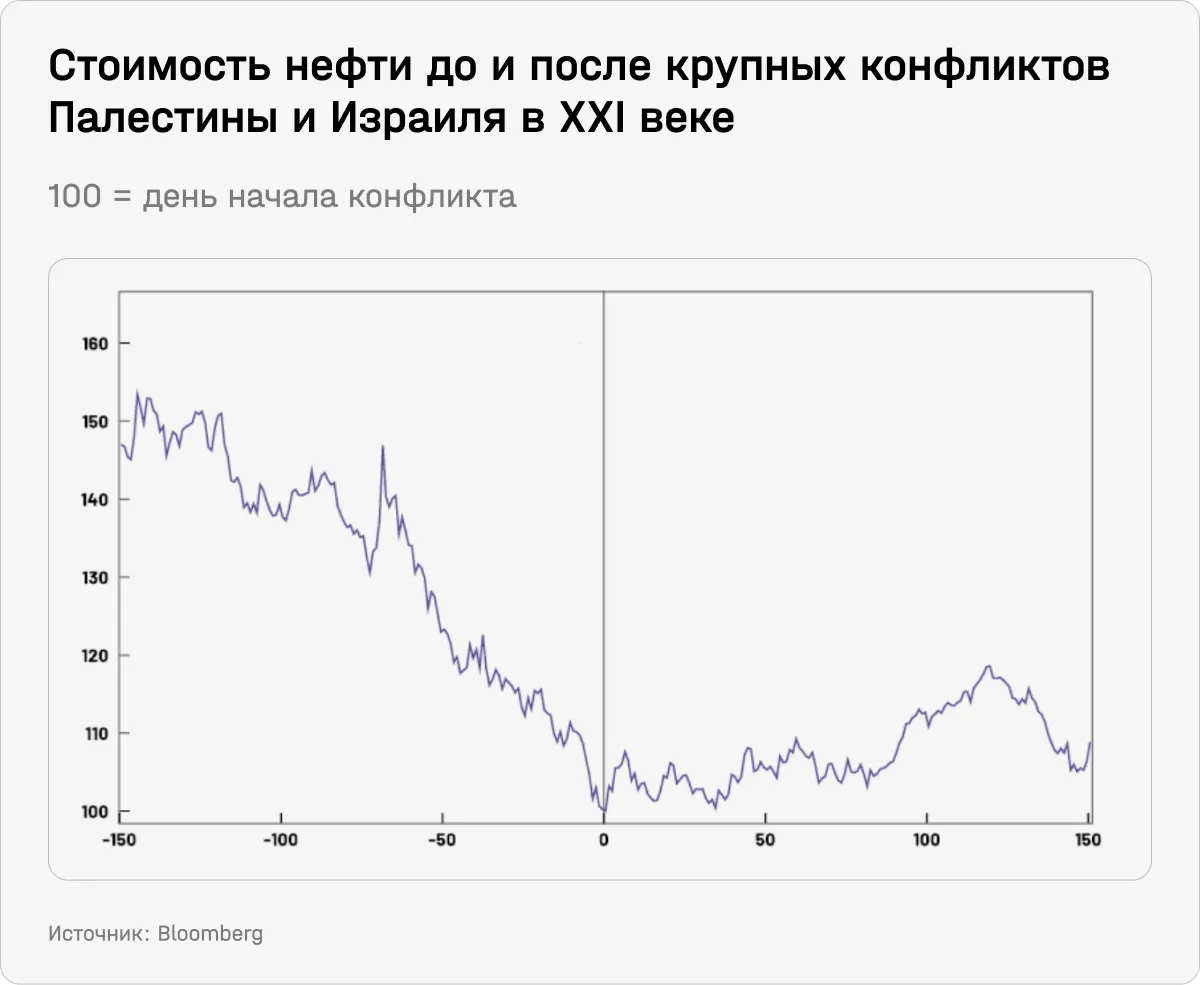В результате рынок нефти, который можно считать лучшим индикатором оценки перспектив эскалации, сохраняет спокойствие: стоимость Brent с понедельника снижалась три дня подряд. Конфликты Палестины и Израиля в XXI веке (в 2000, 2008, 2012, 2014 и 2021 годах) исторически слабо влияли на рынок нефти, подсчитывали в Clocktower Group. Впрочем, в эти годы ни один из них не происходил с полноценным участием других стран.