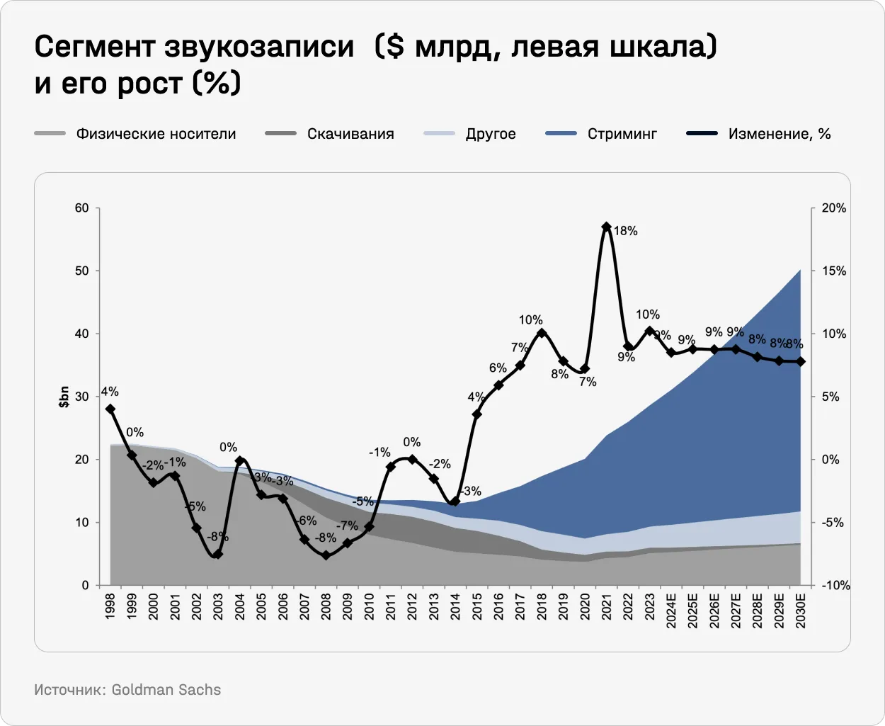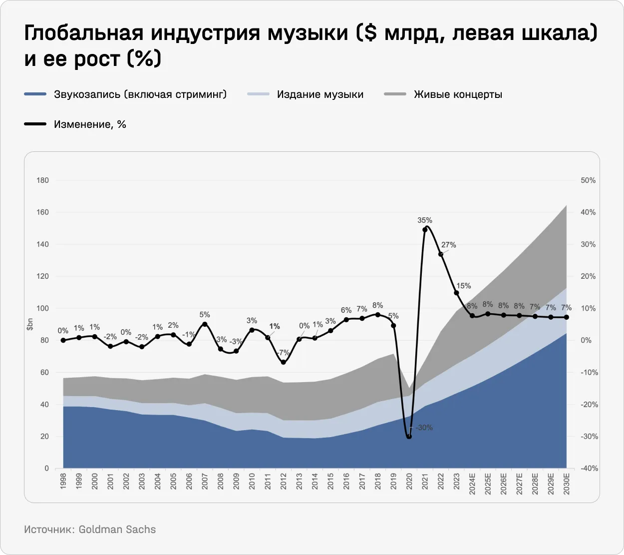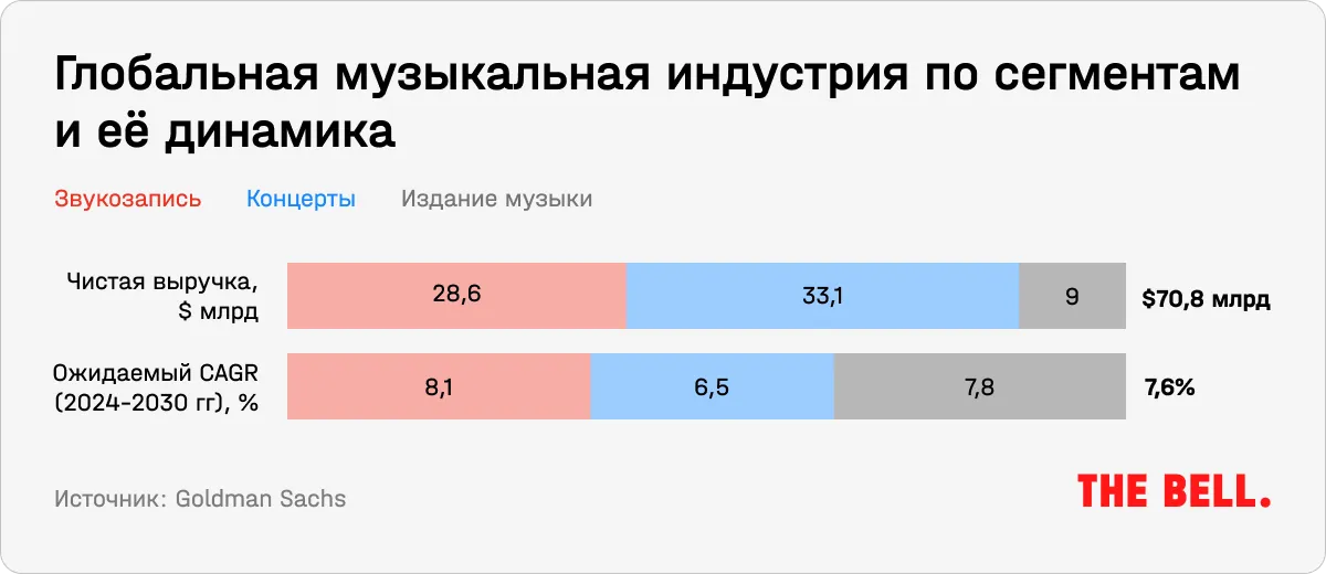 По оценкам Goldman Sachs, в 2023 году вся мировая музыкальная индустрия, включая звукозапись, стриминги, производство музыки и концерты, выросла на 15% против ожидавшихся 7% и заработала $70,8 млрд чистой выручки. Из-за опережающего роста инвестбанк повысил прогнозы по отрасли и теперь считает, что музыкальный рынок в 2024–2030 годах будет расти с CAGR 7,6%. Для сравнения, мировой рынок развлечений и медиа (E&M) в этот же период, по прогнозу банка, будет расти с CAGR 8,5%.