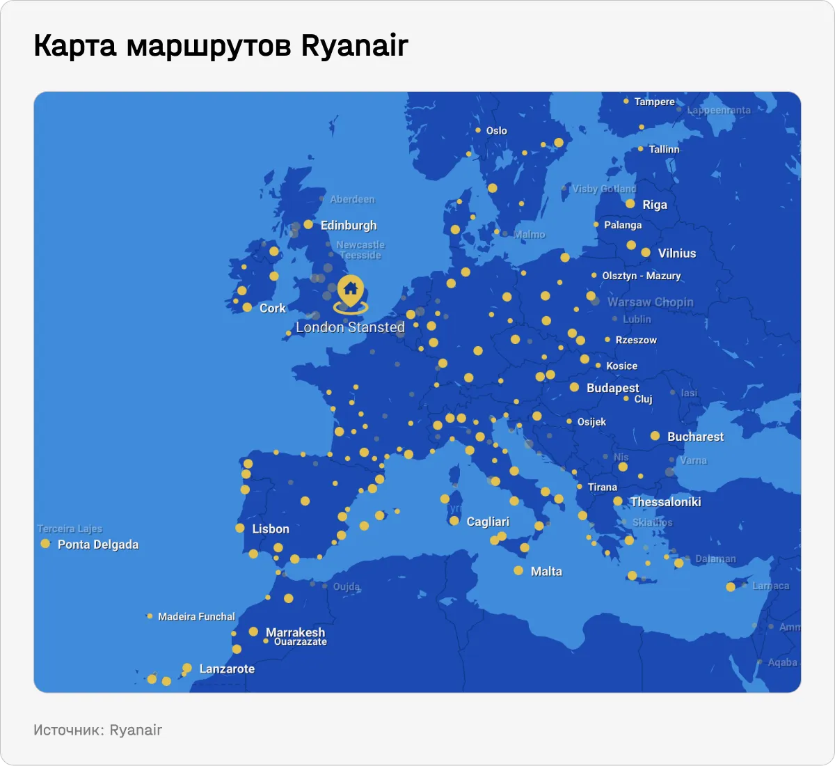 Ryanair — это авиакомпания-лоукостер, которая организует регулярные пассажирские авиаперевозки в 36 странах (Европы и Северной Африке). Она была основана в 1984 году, а ее головной офис находится в Сордсе, Ирландия. Ryanair осуществляет более 3,2 тысячи ближнемагистральных рейсов в день и обслуживает 228 аэропортов.