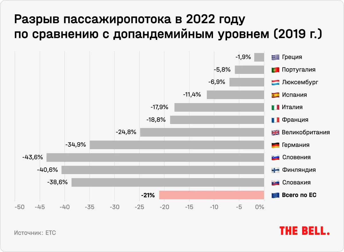 Несмотря на рекордный прирост, величина пассажиропотока в ЕС не восстановилась полностью, показатель остается на 21% ниже допандемийного уровня. По итогам 2022 года только 27% аэропортов ЕС приблизились к уровням 2019 года. Среди них оказались аэропорты Греции, Португалии и Люксембурга. Однако крупнейшие рынки показывают более слабые результаты.