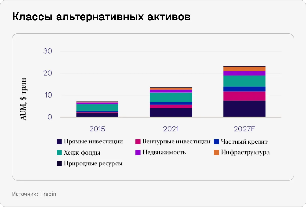 Сейчас весь объем AUM (альтернативных активов под управлением) оценивается в $13 трлн. Как ожидается, показатель будет расти среднегодовым темпом 15,4% (CAGR) и достигнет $23,2 трлн по итогам 2026 года. Для сравнения, общий объем активов под управлением открытых фондов акций, номинированных в долларах США, сейчас составляет $27 трлн.