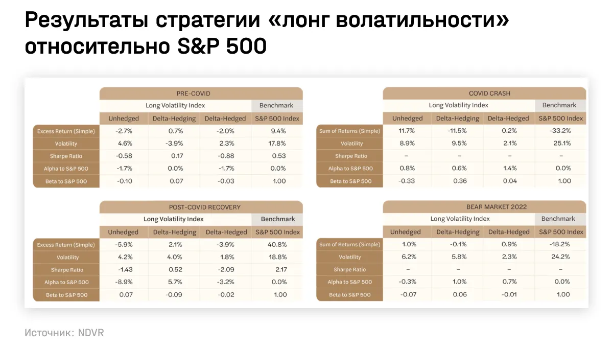 Стратегия с использованием простых («ванильных») опционов показала положительную доходность в оба последних падения, однако результаты сильно отличались в 2020 и 2022 годах (см. табл. ниже). Ситуация осложняется выбором того, следует ли торговать самим S&P 500 в рамках стратегии «длинной волатильности», как это делают многие управляющие. Такая стратегия называется дельта-хеджированием. В 2020 году она превратила прирост от «лонга волатильности» в 11,7% всего в 0,2%.