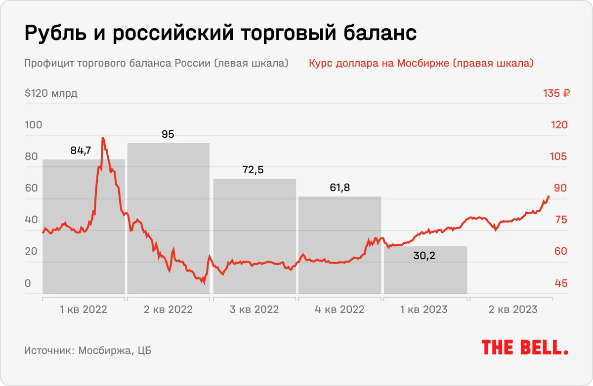Последнее — особенно важно. Ведь в предыдущие годы при сильной девальвации рубля на рынок приходили нерезиденты, стремящиеся заработать на разнице ставок и курсов. Теперь их нет и не будет. В результате курс рубля теперь намного больше, чем раньше, зависит от торгового баланса. Именно его первый зампред ЦБ Ксения Юдаева назвала основным фактором нынешнего падения: «Мы видим существенное сокращение текущего сальдо в этом году по сравнению с прошлым годом и с последним кварталом, это связано и со снижением экспортной выручки, и, по-моему, снижение цен сказалось».