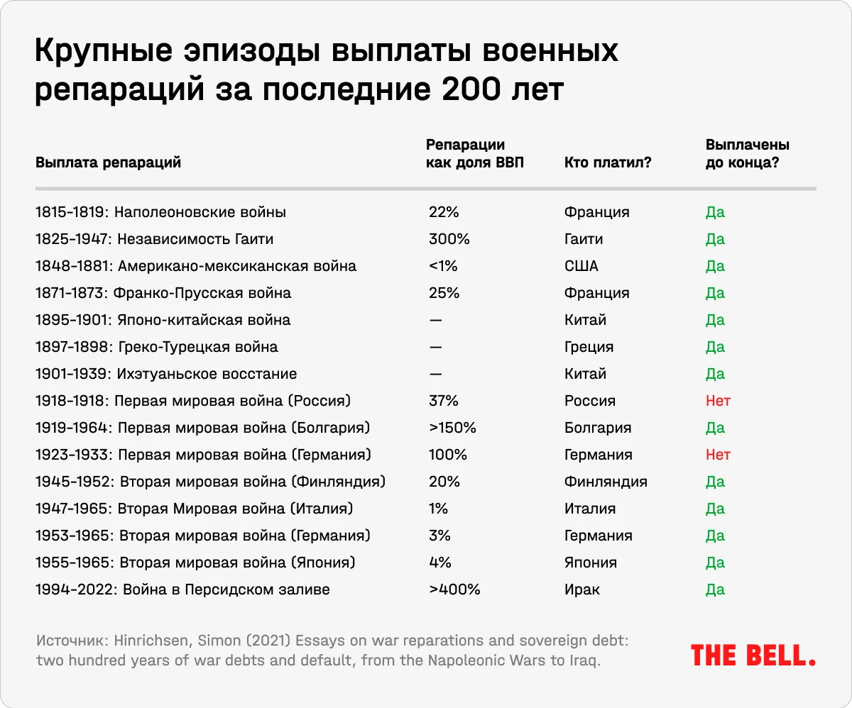 — Почти во всех конфликтах присутствуют репарации, они являются частью мирного урегулирования. По крайней мере, этот вопрос часто поднимается за столом переговоров. Причина, по которой мы почти не видели репараций со времен Второй мировой войны и до наших дней заключается в том, что ни СССР, ни США не требовали выплат от стран, которые попадали под их влияние.