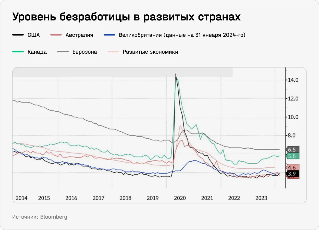 Причины высокого спроса на рабочую силу: старение населения, нехватка квалифицированной рабочей силы и относительно высокие темпы найма компаниями. И все они сохраняются, даже несмотря на повсеместное замедление экономик из-за высоких ставок, отмечает Bloomberg. Согласно квартальным данным ОЭСР, уровень безработицы в развитых странах остается близким к рекордно низким значениям. Власти США в прошлом году прогнозировали, что уровень безработицы к текущему моменту должен был составить 5,9%. В марте она снизилась до 3,8%.
