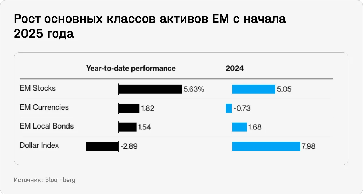 Bloomberg тоже пишет о том, что ожидаемый более слабый экономический рост в США заставляет управляющих портфелями скупать все — от валют Латинской Америки до облигаций Восточной Европы. Капитал уже плавно перетекает в другие регионы, поддерживая рост местных бенчмарков.
