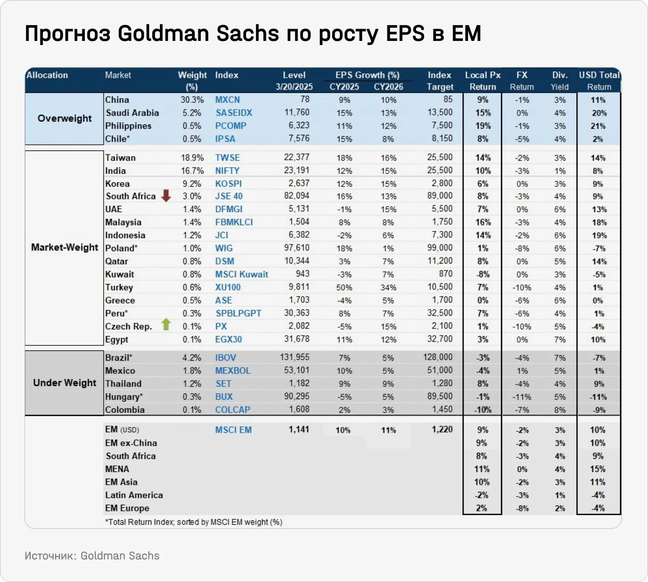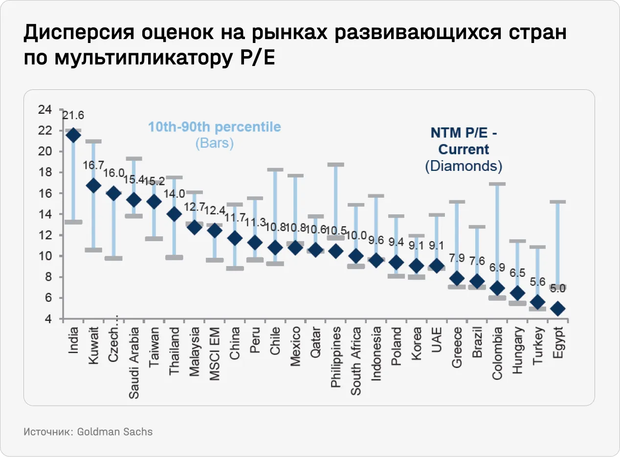 Однако, даже несмотря на текущие сложности, фондовый рынок Индии ($5 трлн) уже превзошел по капитализации большинство стран G7 и в последние годы создал больше «мультибэггеров» (фирмы, чьи акции способны кратно вырасти в цене), чем любой другой крупный рынок. Консенсус-прогноз по темпам роста ВВП Индии — 6,5% в 2025 году и 6,7% в 2026 году — это выше не только США и Европы, но и других стран, входящих в индекс MSCI EM. Это означает, что инвесторы все равно могут найти там привлекательные активы, но часто они переоценены, поэтому стоит смотреть на фундаментальные показатели (впрочем, как обычно).