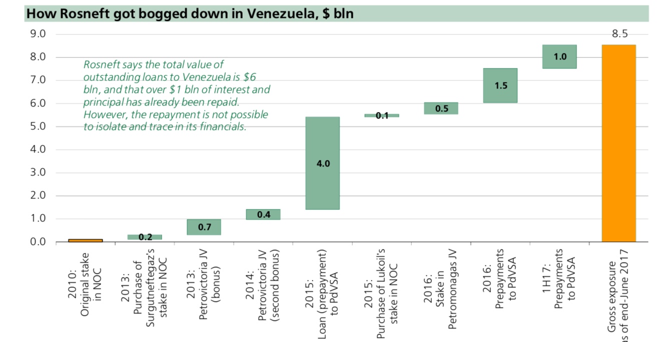 • По расчетам Sberbank CIB, за несколько лет госкомпания «закопала» в Венесуэле $8,5 млрд, из которых больше $6 млрд в качестве предоплаты за будущие поставки нефти получила венесуэльская госкомпания PDVSA. На конец сентября 2018 долг венесуэльской компании перед российской составлял $3,1 млрд. «Если правительство Мадуро продержится, «Роснефть», скорее всего, продолжит быть чистым донором страны. Если режим рухнет, «Роснефть» может потерять там все свои активы», — прогнозировали аналитики Sberbank CIB.