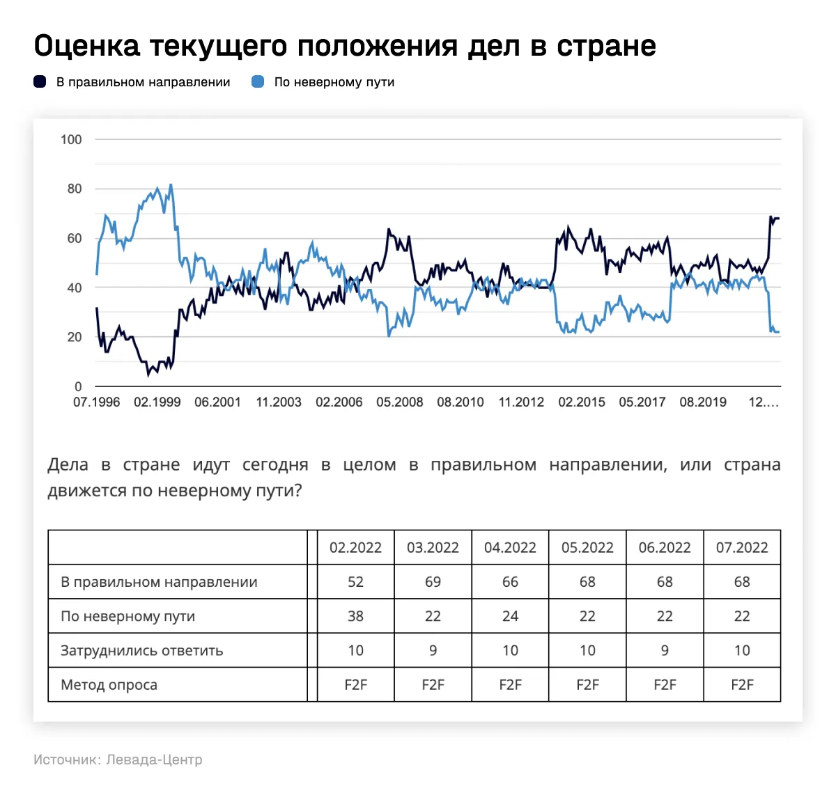 Конкретно сейчас на протяжении пяти месяцев, с марта по июль, основные показатели общественного состояния — отношение к властям, к военной операции и т.д. — замерли. Казалось бы, сколько всего произошло, сколько людей погибло. Почему российское общественное мнение замерло? Это шок, ужас от происходящего, оцепенение или это все-таки надежда на триумф, с ожидания которого власть начинала эту историю? Я не берусь поставить такой диагноз.