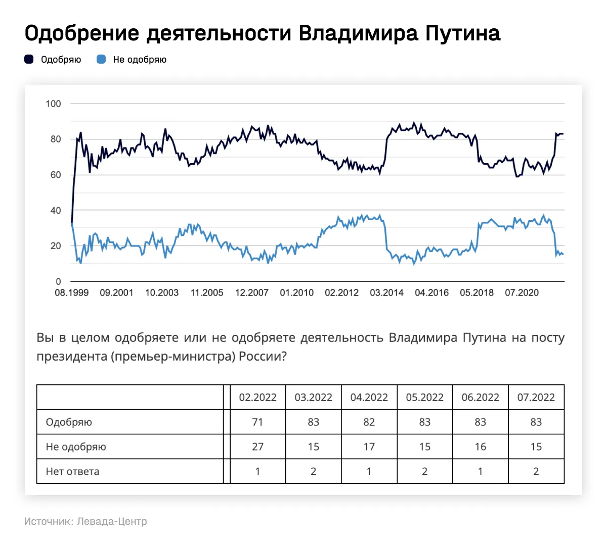 Да, для Путина всенародная поддержка — это, видимо, важный ресурс. И его стараются поддерживать на высоте. Трудно не заподозрить, что Путин или его советники считали, что маленькая победоносная война положительно скажется на рейтинге. Военные действия в Грузии и присоединение Крыма подняли рейтинг Путина до предельных значений в 88% в 2008-м и 2014-м. И сейчас его рейтинг подскочил с 65% в декабре 2020 года до 83% уже в марте (в июле этот показатель также составлял 83%. — The Bell).