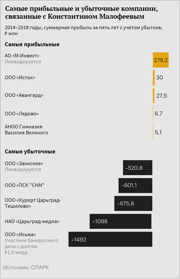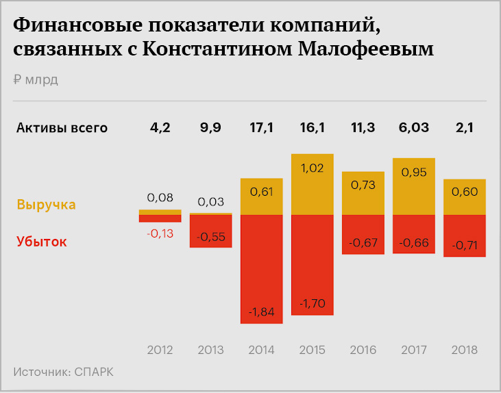 В него, судя по открытым данным, входят два десятка компаний, но реальных активов у них немного. Самые крупные — построенный Малофеевым отельный комплекс «Царьград» в деревне Спас-Тешилово Московской области, агрокомплекс, медиагруппа «Царьград» и курорт «Ливадия» в Крыму. Все компании, если верить их отчетности в СПАРК, закончили прошлый год с потерями в 700 млн рублей, а стоимость их активов упала больше чем в два раза — до 4,2 млрд рублей. В предыдущие несколько лет, с 2013-го по 2017-й, размер убытков компаний Малофеева варьировался от 550 млн рублей до 1,8 млрд рублей в год.