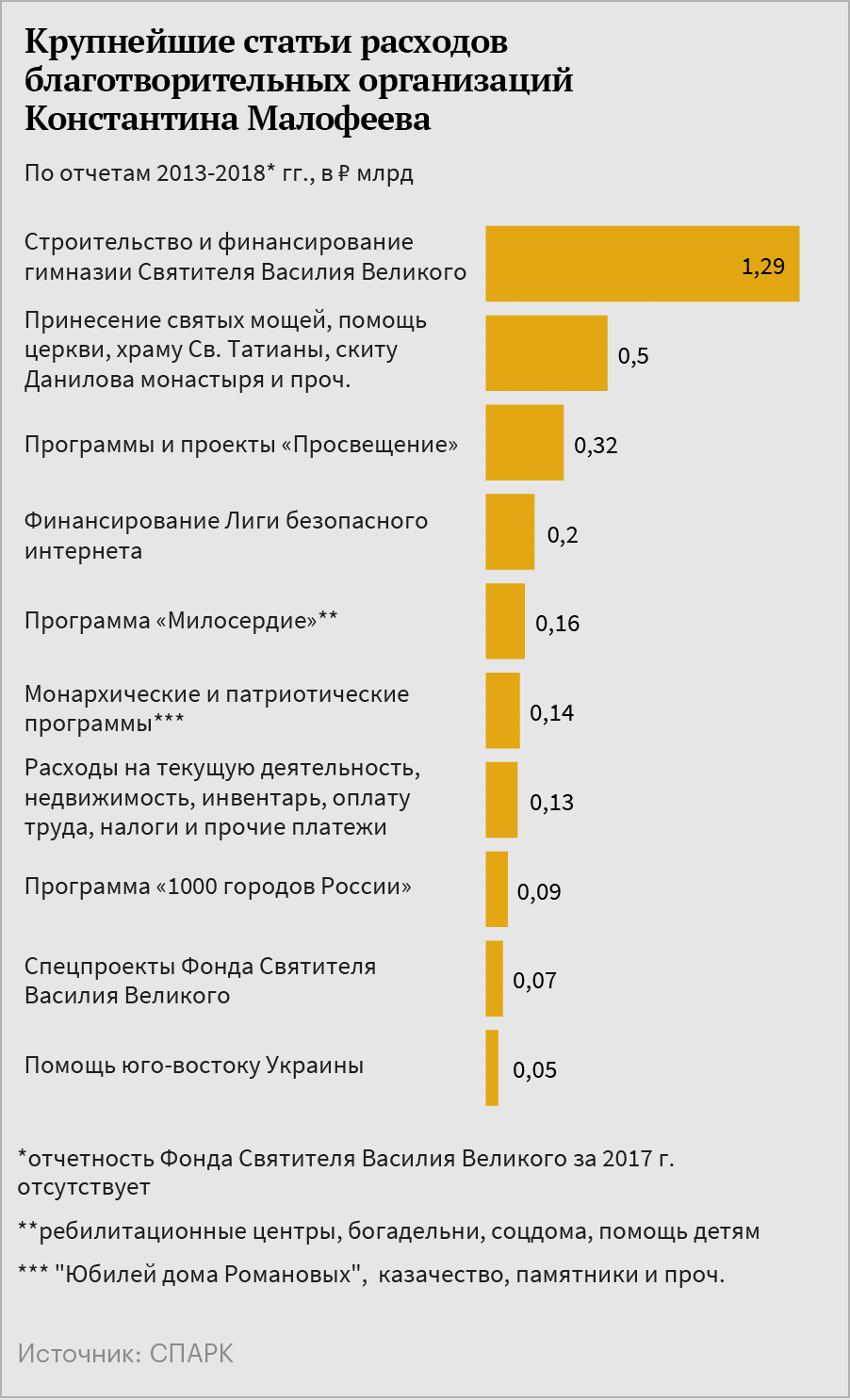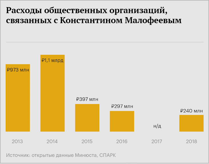 Кроме холдинга «Царьград», с Малофеевым связано больше десятка благотворительных фондов и общественных организаций. Но, судя по их отчетам, щедрое финансирование для них закончилось одновременно с введением санкций. Судя по цифрам, главное детище Малофеева — медиакомпания «Царьград», она же приносит большую часть убытков.