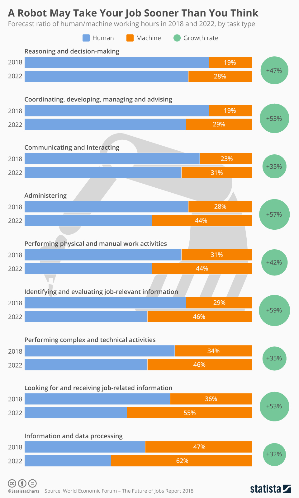 Из-за развития современных технологий к 2022 году исчезнет 75 млн рабочих мест, считает Всемирный экономический форум. Если в 2017 году машины выполняли только 29% рабочих задач, то в 2022 году этот показатель увеличится до 42%, а в 2025 году и вовсе превысит 50%. Сокращение, в частности, коснется «белых воротничков» — бухгалтеров, секретарей, аудиторов и прочих. Но не все так плохо — развитие технологий также приведет к появлению 133 млн новых рабочих мест, особенно в таких сферах, как высокоскоростной мобильный интернет, ИИ, аналитика больших данных и облачные технологии. Среди новых профессий — специалисты по новым технологиям, специалисты по переходу на цифровые технологии и т. д. Таким образом, переучиваться в следующие пять лет придется 54% нынешних работников. Посмотреть, как конкретно будет автоматизирована та или иная сфера, можно на этой инфографике.
