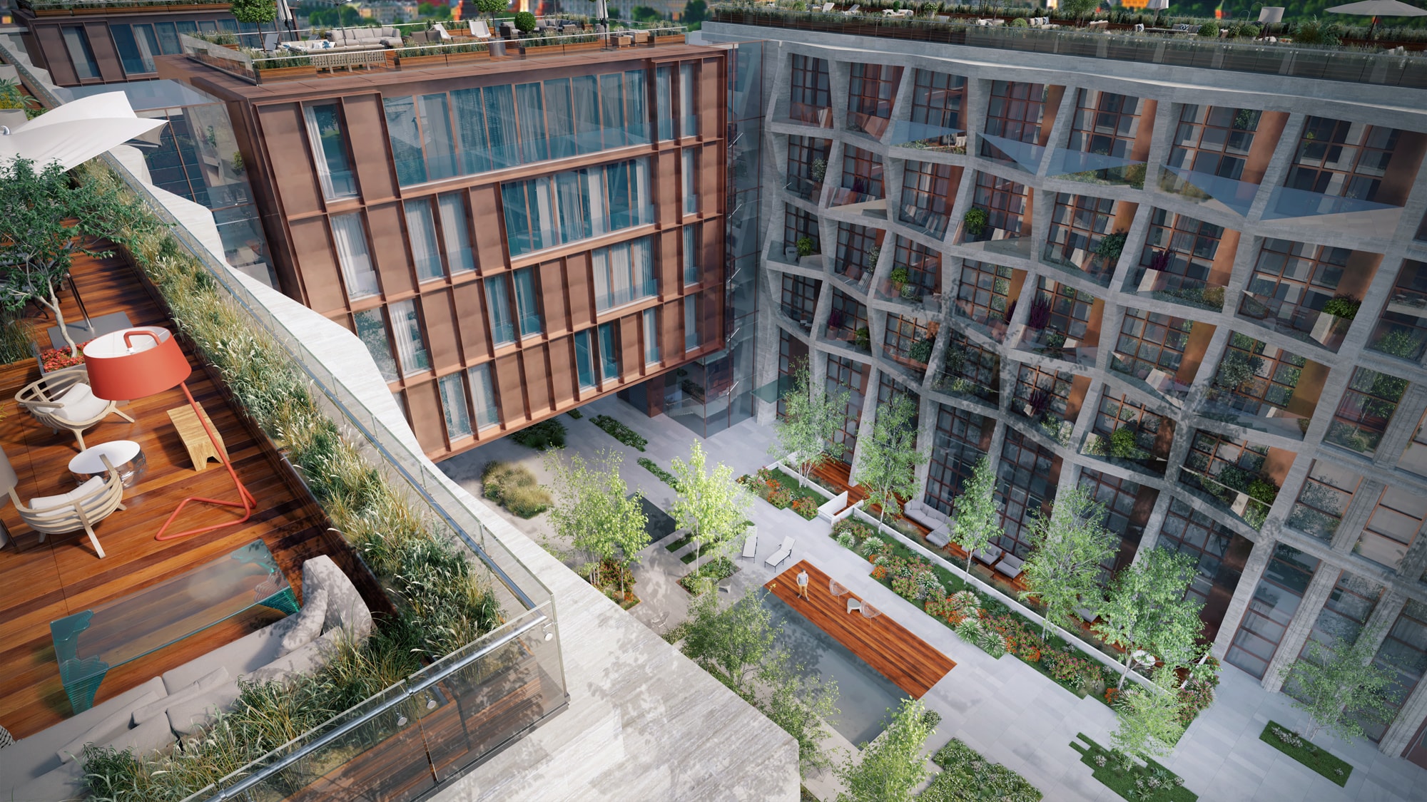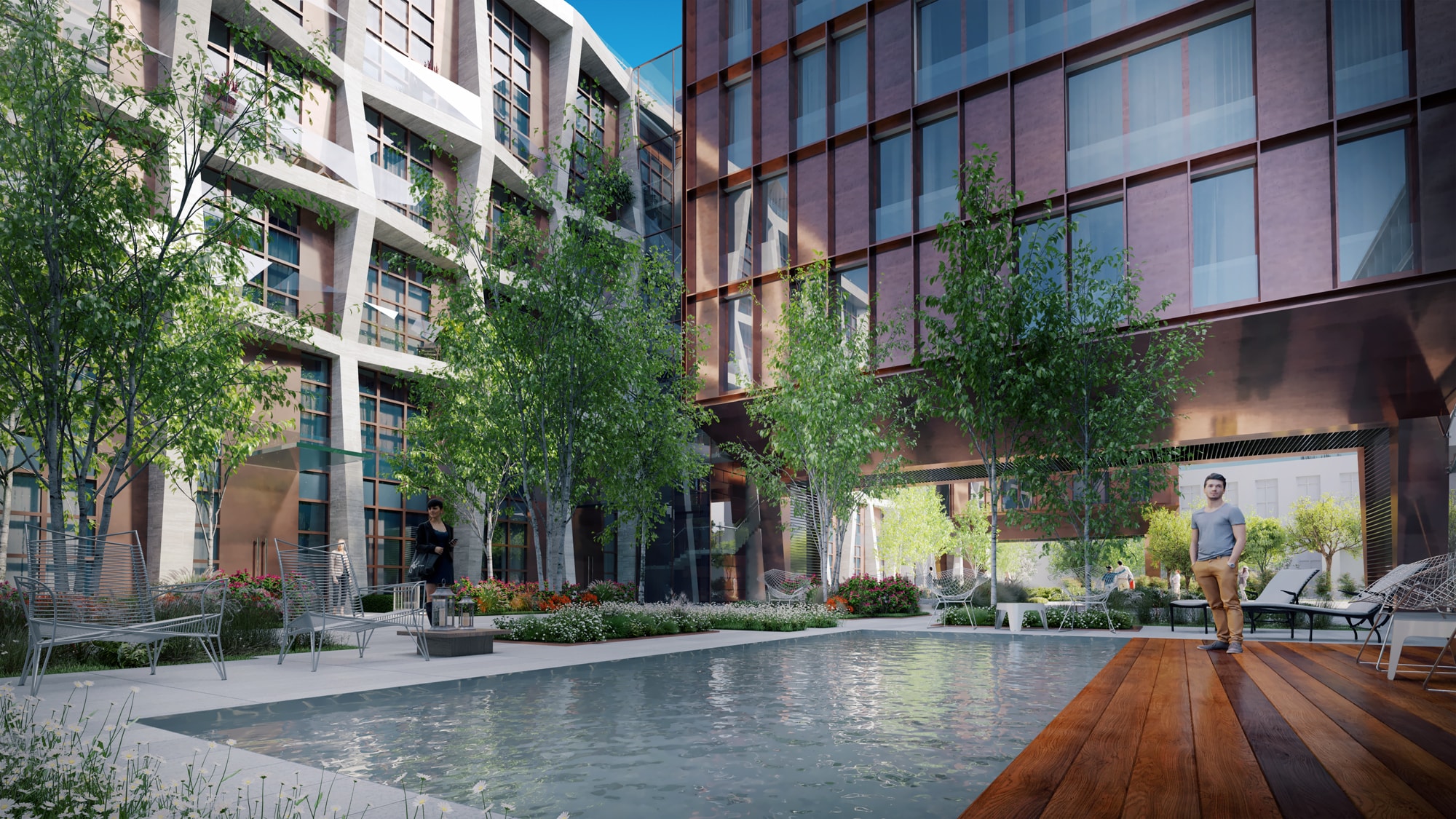 - Рынок элитной недвижимости в Москве очень конкурентен, поэтому застройщики вынуждены искать баланс между выгодой, оригинальностью решений и комфортом жильцов. В результате в закрытых дворах появляются собственные парки и даже медитативные зоны. Наличие подобных общественных пространств, как правило, не влияет на цену квартир. Напротив, они рассматриваются как неотъемлемая часть современного дома, где можно чувствовать себя уединенно не только в квартире, но и на всей территории рядом. Поэтому в Insigma Group решили пойти еще дальше, преобразовав часть коммерческих площадей на цокольных этажах в апартаменты с патио. Этот формат жилого помещения с выходом на собственную веранду очень востребован среди горожан. В результате удалось частично компенсировать возможные потери из-за отказа от бизнес-аренды помещений. При этом оставшуюся территорию превратили в сад с авторским дизайном Анны Андреевой, законодателем современного озеленения и городской среды. Также там планируется разместить небольшие зеркальные водоемы для отдыха и релаксации.