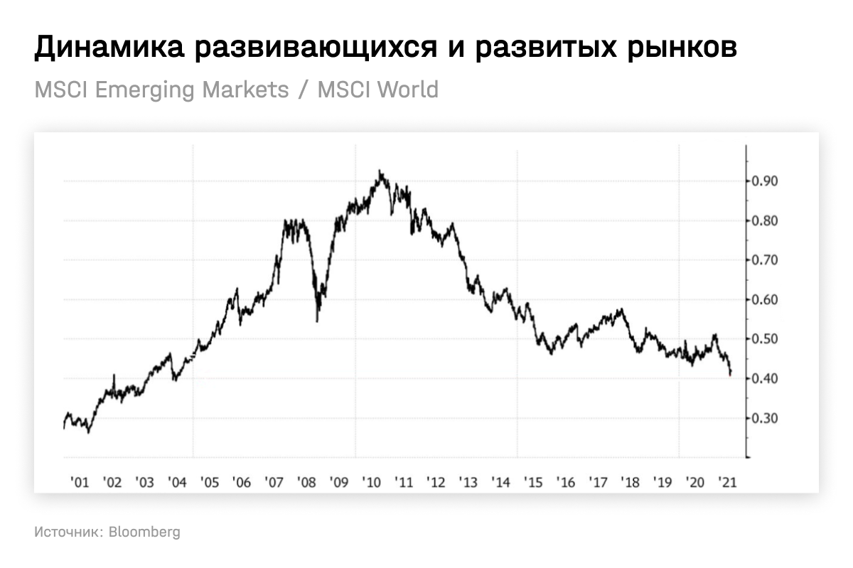 Опережающая динамика развивающихся стран на фоне роста стоимости сырья после кризиса, относительно небольшого ослабления доллара и повышенной инфляции во всем мире вполне логична, говорит Русецкий. Однако, по его мнению, после окончания восстановления экономики и цикла роста сырья через несколько лет компании роста из США, в частности из IT-сектора, снова будут доминировать из-за увеличения роли технологий.