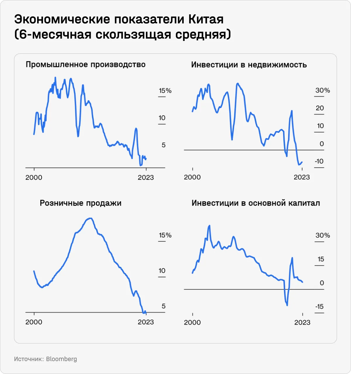 В первой половине 2023-го сбережения китайских домохозяйств снизились на $1,7 трлн — это на 15% больше, чем годом ранее, когда в КНР еще были серьезные пандемийные ограничения. Многие компании, в том числе технологические, опасаются новых атак регуляторов и снижают инвестиции. Поэтому ситуацию в Китае также часто сейчас называют «кризисом доверия».