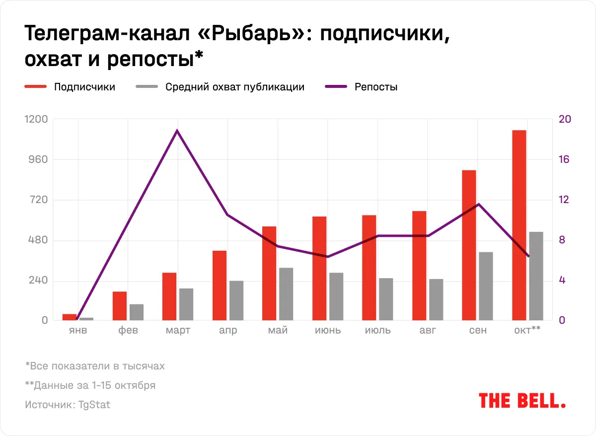 Популярность «Рыбаря», конечно, не ограничивается западными экспертами и СМИ: в составленном The Bell рейтинге канал занял четвертое место по числу подписчиков с 1,13 млн подписчиков, хотя еще 23 февраля 2022 года их число не превышало 38 тысяч. Каждый пост «Рыбаря» читает почти 600 тысяч человек, а по индексу цитируемости в Telegram он опережает Дмитрия Медведева, Вячеслава Володина и Маргариту Симоньян.