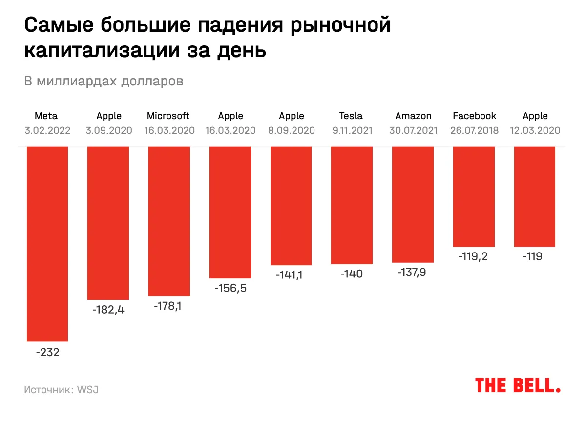 Facebook, недавно сменившая имя на Meta, стал единственным из отчитавшихся бигтехов, не оправдавшим ожидания аналитиков по финансовым показателям — да еще как. На постмаркете после публикации отчетности в среду акции компании упали на 24%, а на торгах в четверг падение усугубилось до 27% по итогам дня.